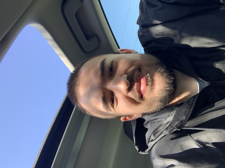 A single adult male, approximately 20-30 years old, is depicted in a close-up selfie taken from inside a vehicle