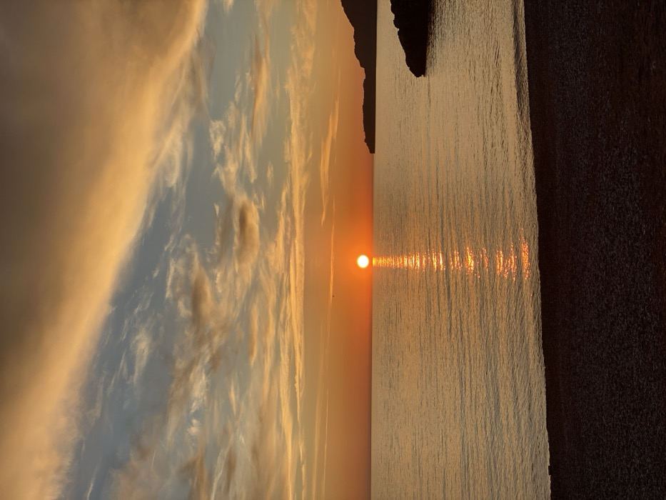 This image depicts a coastal sunset scene in Sveti Stefan, Montenegro. The horizon line is visible across the mid-section of the frame, separating the sky from the sea. The sky exhibits a gradient of colors, transitioning from deep orange and brown tones at the top to lighter orange and blue-grey hues near the horizon, populated by wispy, horizontally oriented clouds. A prominent, spherical, bright orange sun is situated directly on the horizon, slightly to the left of the image's vertical center. The sea surface is calm, reflecting the sun's light as a distinct, shimmering vertical column of bright orange extending from the sun towards the foreground. The water itself appears dark orange to brown. On the right side, a dark, silhouetted landmass with an uneven profile extends into the sea from the mid-ground. Closer to the foreground on the right, dark rock formations are visible at the water's edge. The foreground consists of a dark, pebbly beach, with small, uniformly sized pebbles covering the lower portion of the image. A small, dark, airborne object, possibly a bird, is faintly discernible to the immediate left of the sun. No human figures, specific actions, or interactions are present in the scene.