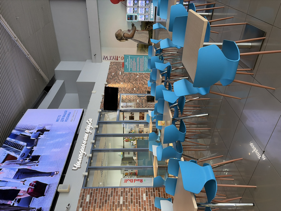 A modern airport cafe features rows of light-blue chairs arranged at tan-colored tables. A brick wall backdrop supports glass windows displaying interior merchandise. A Red Bull sign is visible. Above, a digital billboard shows travelers with luggage. A mural depicts a girl by a digital display. A banner is mounted on a brick wall. A television screen is also mounted.