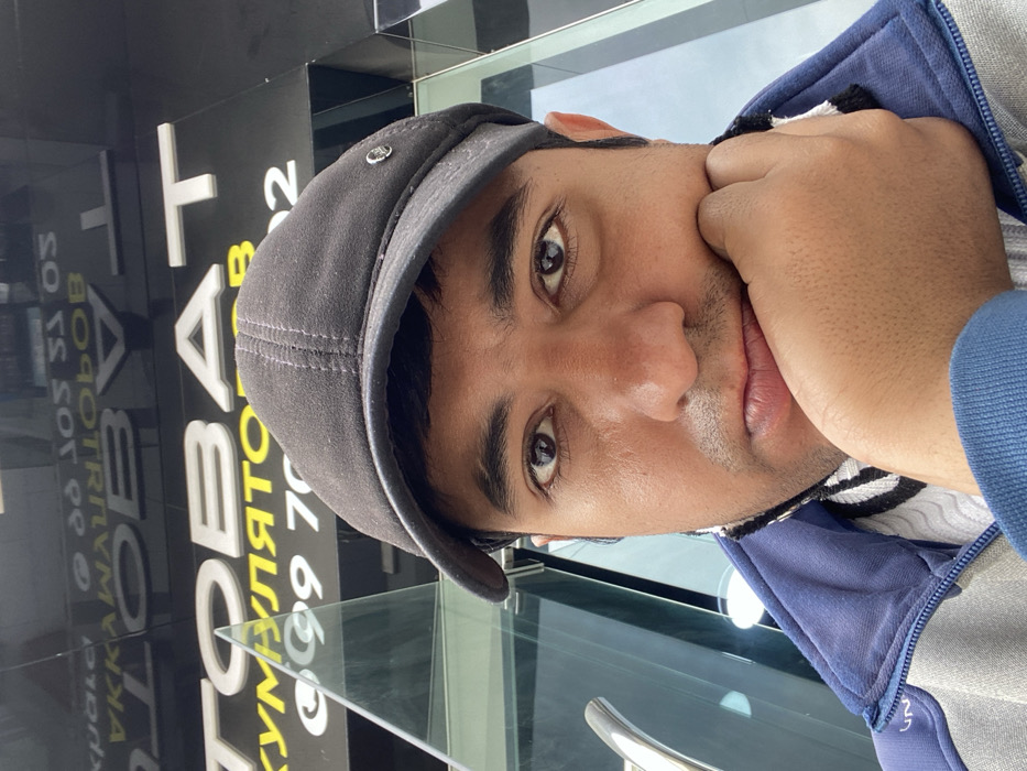 A male subject is depicted in a close-up, eye-level portrait, centered in the frame. The individual possesses a medium-dark complexion, dark eyes, and short dark hair, partially concealed by a dark grey fabric baseball cap. He wears a blue and grey zippered outer layer over a white and black striped garment, which appears to be a scarf or sweater collar. His right hand is positioned beneath his chin, with fingers gently curled. The subject maintains a direct gaze at the camera with a neutral facial expression. The background reveals a modern building facade featuring dark, reflective glass panels and a black section displaying white Cyrillic text. Clearly legible characters include "ТОВАТ" (GOODS) and "АККУМУЛЯТОРОВ" (BATTERIES/ACCUMULATORS), indicating a commercial establishment specializing in batteries or similar goods. A partial phone number "99 70..." is also discernible beneath the Cyrillic text. Reflections of the surrounding environment and inverted text are visible in the upper glass panels. The scene is located in the city of Bukhara, Uzbekistan, consistent with a storefront setting.