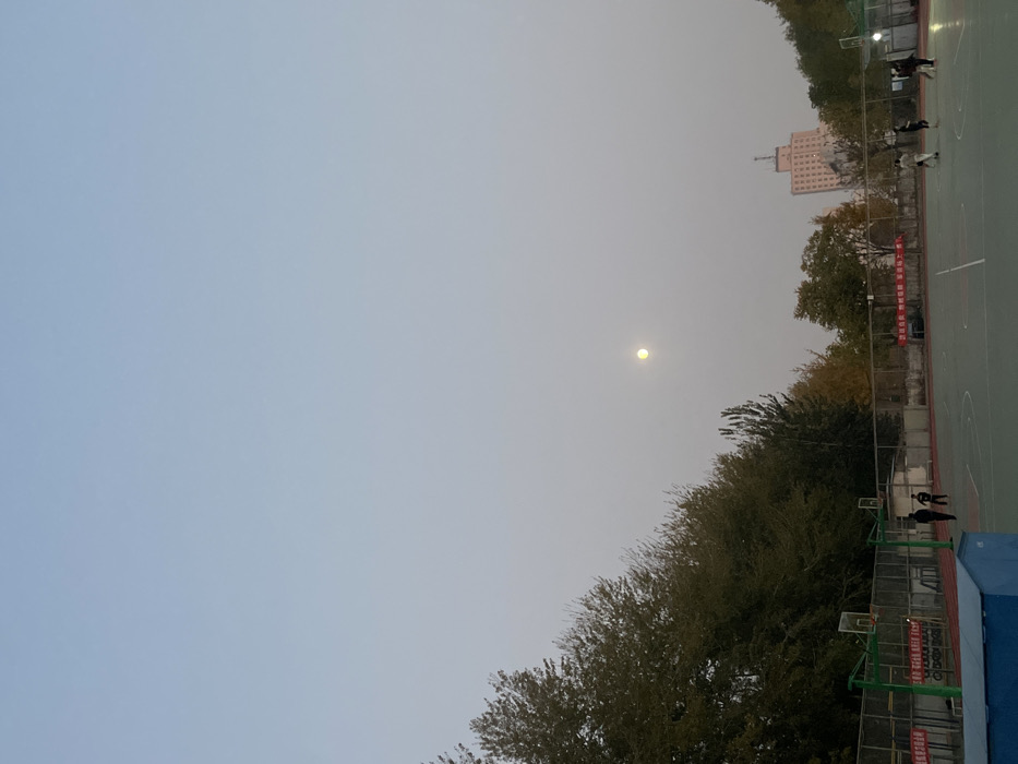 The image depicts an outdoor basketball court scene at twilight within Daxing District, China. The upper portion of the frame features a pale, grey-blue sky with a bright yellow-white moon positioned near the center. In the lower left foreground, a blue utility box is partially visible. The primary subject is a green-surfaced basketball court marked with white lines, equipped with two green-framed basketball hoops and backboards along its left edge. A wire mesh fence encloses the court. Seven individuals are present on the court: two on the left side, one walking away from the camera, and five grouped on the right, engaged in activity suggestive of basketball. They are dressed in casual clothing. Red banners with white Chinese characters are affixed to the fence in the background. A dense line of trees with green and some autumnal foliage borders the left side and rear of the court. In the distant background, a light-colored, multi-story building with a distinctive tiered roof structure is visible above the treeline on the right.