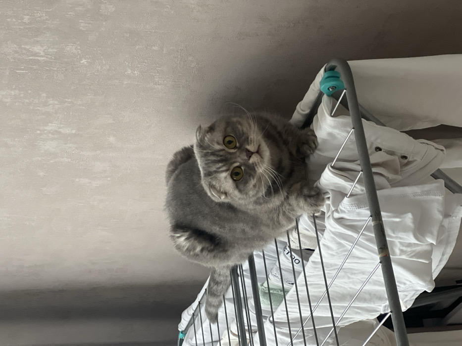 - "An indoor scene in the city of Votkinsk, Russia, depicts a grey tabby Scottish Fold cat positioned on a metal clothes drying rack" by FM-A5lOj2, licensed under CC BY 4.0