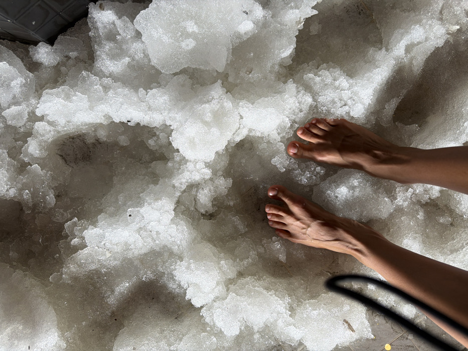 - "A person's bare feet stand on a pile of crushed ice" by FM-JxfQU2, licensed under CC BY 4.0