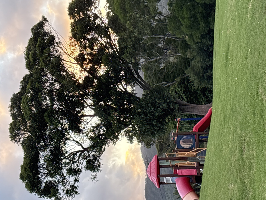 This image depicts a children's playground situated on a grassy incline in Bulli, Australia. The playground features a multi-level structure with red pitched roofs, a red tube slide, an open red slide, yellow ladders and platforms, and blue swing chains (swings not fully visible). A large, mature deciduous tree with a thick trunk and dense green foliage stands directly behind the playground structure and occupies the central-right portion of the frame. In the background, forested hills rise, partially obscured by the tree canopy. The sky above is cloudy, with a warm, golden-orange light, indicative of either sunrise or sunset, visible through and behind the tree branches and clouds. No individuals are present in the scene. The foreground consists of neatly mown green grass.