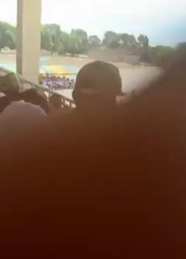 The video depicts a gathering of people wearing white shirts, pants, black belts, and green caps, presumably in a formal setting. They are seated in what appears to be a covered stadium or large open structure, looking out onto a central area where another group is gathered. The structure has a metal roof and is supported by light-colored pillars. The central area is exposed to the open sky. Trees and buildings can be seen in the distance. People on the bleachers are observing the event unfolding in the center area. The overall atmosphere suggests an official ceremony or event.