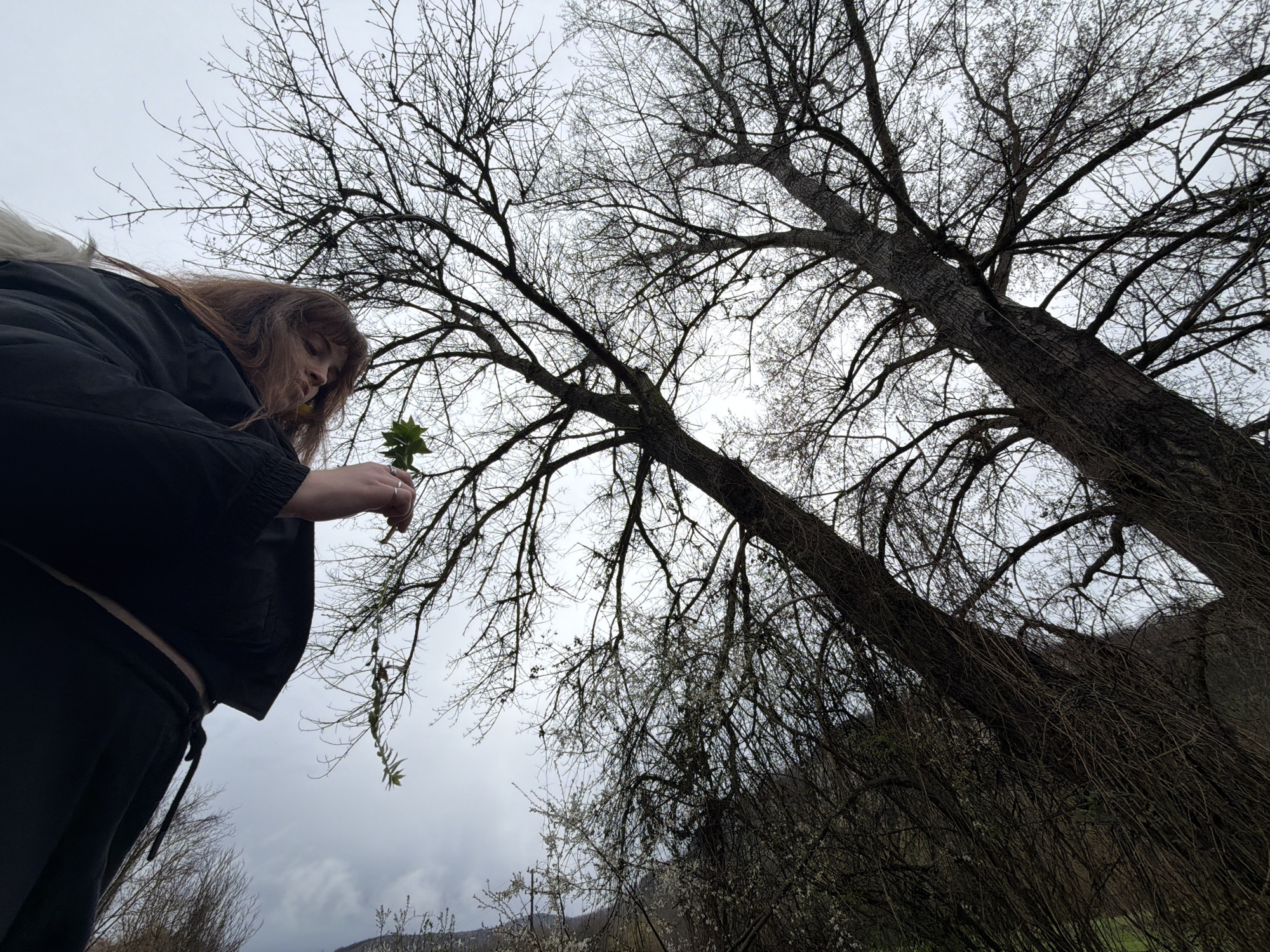 A low-angle outdoor photograph depicts a woman holding a small sprig of green leaves. She is positioned on the left side of the frame, wearing a black jacket and dark pants, with long brown hair that partially obscures her face as she looks down at the leaves. Behind her, and occupying most of the frame, are several tall, leafless trees with intertwined branches against a cloudy sky. The trees are located in a wooded area, with some shrubs and undergrowth visible in the lower right portion of the image. The exact location in Unknown, Bulgaria is undeterminable from the image.