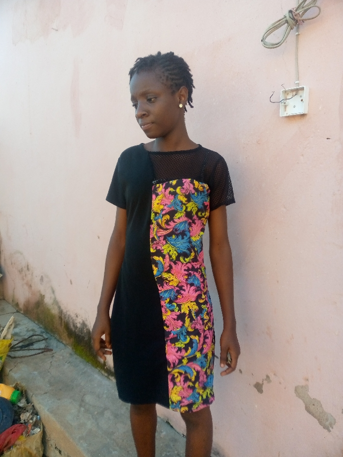 A young individual is depicted standing outdoors against a light pink wall in Sabon Tasha, Nigeria. The subject, a Black female, has short, dark braided hair and wears small, light-colored stud earrings. She is dressed in a short-sleeved, knee-length dress that is predominantly black, featuring a vertical panel of multi-colored ornate baroque patterns (pink, blue, yellow, green, black) on the right side. The top of the left shoulder and sleeve appear to have a black mesh overlay. Her head is slightly tilted downwards and to her right, and her expression is neutral. The wall behind her is aged, with visible areas of chipped paint, discoloration, and dark stains, particularly at the lower left. In the upper right corner of the image, an exposed electrical installation is present on the wall, consisting of a beige electrical conduit, a coiled length of beige wire, and a white rectangular electrical box with exposed wiring. The ground is a concrete surface, with a slight elevation from the left where minor debris, including a yellow object and dark fabric, is visible. The scene is illuminated by natural light, casting minimal shadows.