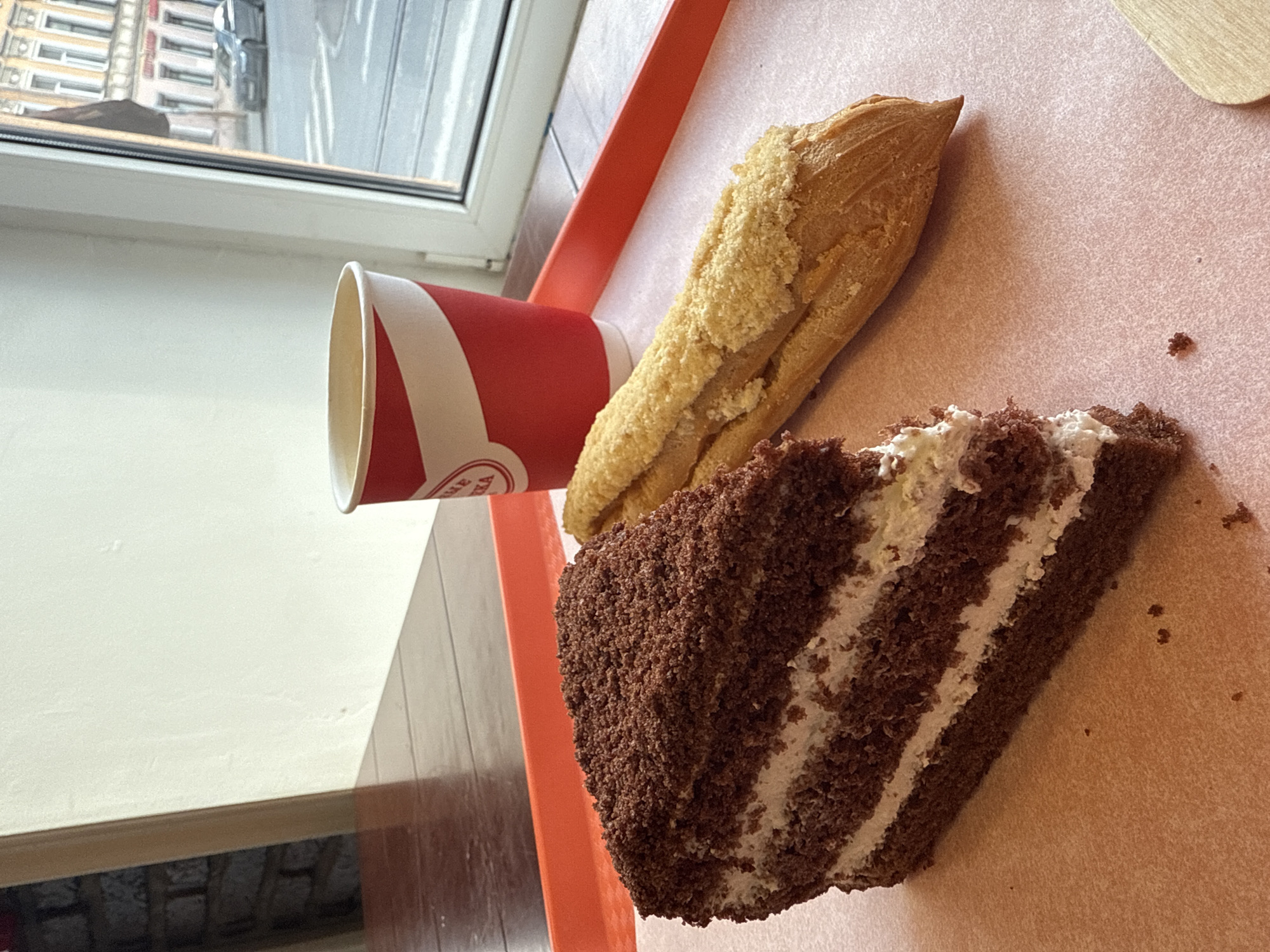 The image displays an indoor scene, likely a cafe or bakery in Saint Petersburg, Russia, overlooking an urban street. In the foreground, a red plastic serving tray, placed on a dark brown wooden tabletop, holds food items and a beverage cup on a light pink paper liner. To the left, a triangular slice of dark chocolate cake is present, characterized by multiple layers of white cream filling and a top surface densely covered with dark brown crumbs. Adjacent to the cake on the right, an elongated, light-golden brown pastry features a distinct, coarse, light-yellow crumbly topping. Behind these, a red and white striped paper cup contains a beverage; partial Russian text on its surface reads "ВЫПЕЧКА" (Baked Goods) and "ПИРОГ" (Pie). A small, light-colored wooden utensil is partially visible on the tray's far right. The immediate background reveals a white wall, with a segment of a dark brick wall visible on the far left. A large window, framed in white, dominates the right portion of the background, offering a view of a city street. Across the street, an ornate, multi-story building with a light yellow facade and white architectural details, including window frames and cornices, is visible. The street features parallel tram tracks and a white pedestrian crosswalk. A dark grey sedan is observable on the street. The scene is illuminated by natural light, indicating daytime. No individuals, actions, or interactions are present within the frame. The architectural style of the visible building is characteristic of Saint Petersburg.