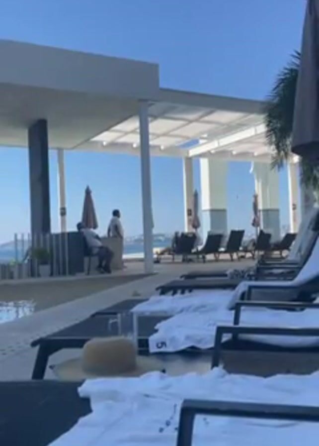 poolside area at a resort or hotel. Several lounge chairs are arranged, covered with white towels. One chair has a straw hat on it. Beyond the chairs is a pool and a covered outdoor area supported by white pillars. In the distance, people are sitting or standing. The sky is clear and blue. A palm tree is visible to the right of the frame.