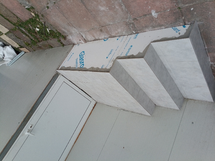 The scene depicts a newly constructed exterior staircase and an adjacent door in Varna, Bulgaria. The staircase consists of three tiled steps with light grey or beige square ceramic tiles. The risers and sides of the stair structure are partially covered with white protective sheeting featuring "Glasro" and "British Gypsum" branding, indicating ongoing construction or recent completion. Mortar residue is visible on the protective sheeting and around the edges of the tiles. To the right of the staircase, a white, rectangular single-panel door with a white handle is set into a light-colored, vertically paneled wall. The door frame is dark, likely black or dark grey, contrasting with the white door panel. The wall above the stairs and around the door is uniformly light-colored. The ground in front of the stairs and to the right is paved with irregular reddish-brown and grey-brown concrete pavers. Sparse green weeds and some scattered debris, including small pieces of metal and plastic, are visible between the pavers. To the far right, near the wall and beyond the door, white bags (possibly containing building materials) and several long, thin metal profiles are stacked on the paved ground. No individuals are present in the scene, and no specific actions or interactions are depicted. The lighting suggests an outdoor environment, possibly under natural daylight.