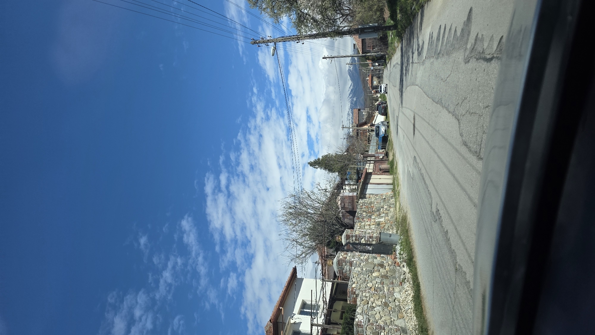 street in the village of Slatino, Bulgaria. The view is taken from inside a vehicle, looking out the passenger window. A section of the interior trim of the vehicle is visible on the right. The street is asphalt, with visible cracks and patches. On the right side of the road are houses and fences made of stone and brick. Utility poles run along the right side of the street with wires overhead. In the distance, mountains are visible under a sky with scattered clouds. The sky is predominantly blue. The vegetation appears to be sparse, suggesting it may be early spring or late autumn. The houses are of varying sizes and styles, typical of rural construction. Several vehicles are parked along the street in the distance.