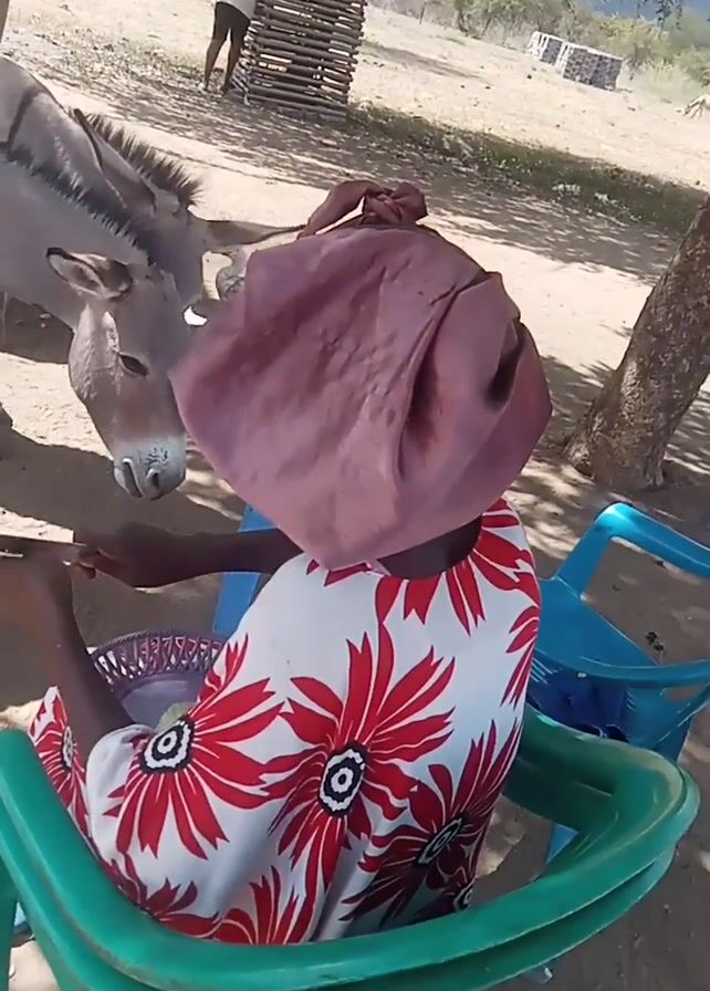 A person wearing a white dress with red flower patterns and a large, dusty-rose head covering is seated on a green plastic chair. The person is slicing food on a plate with a knife and giving it to two donkeys that are standing in front of the chair. A chicken walks around the person's feet. The setting appears to be a rural outdoor area with a sandy ground and some trees. There is a fence or enclosure in the background.