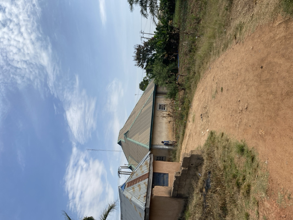 This image depicts a semi-rural landscape in Du, Nigeria, under a bright, partly cloudy sky. A reddish-brown dirt path, showing signs of wear, curves from the lower-left foreground towards the center-right. On the left side of the path, a single-story building with light tan, unrendered walls and a severely rusted, corrugated metal roof is visible. It features a single window with blue horizontal shutters. A low, unfinished concrete block wall extends from this building towards the foreground. Further along the path and to the right, a larger, light-colored (cream or beige) single-story building stands. It is topped with a distinct, multi-pitched roof made of corrugated metal, painted or coated in a dull green. Several small, white-framed, gridded windows are visible on its side. A single male individual is standing between these two buildings, near the left corner of the larger structure. He is wearing a light-colored shirt or vest over darker trousers. His posture is relaxed, and he appears to be observing something beyond the frame to the right. To the right of the larger building, the terrain rises slightly, covered with a mixture of green and dry vegetation, including what appear to be banana plants and tall, dried crop stalks. Utility poles with power lines run horizontally across the mid-background. A tall, slender communications tower or antenna is visible in the distant background against the light blue sky, which has scattered white cirrus and cumulus clouds. A portion of a palm frond is visible in the upper-left corner.