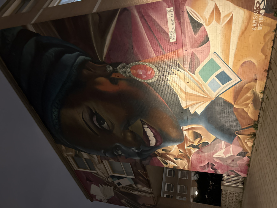 - "A large-scale mural is displayed on the brick facade of a multi-story building at night in The Hague, Netherlands, illuminated by artificial light" by FM-4p8pq1, licensed under CC BY 4.0