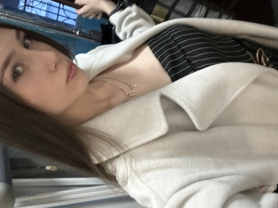 A woman's selfie shows her with long brown hair, light skin, and a neutral expression. She wears a white coat or sweater, partially unbuttoned, revealing a black and white striped top. A delicate gold necklace with charms rests on her chest. In the background, a window with a blue frame is visible, along with the presence of another person's arm and hand. The photograph is slightly angled and tilted.