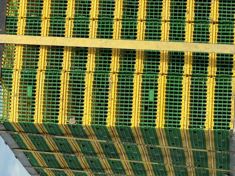 Stacked green and yellow plastic crates, secured by two wide yellow straps, form a grid-like pattern