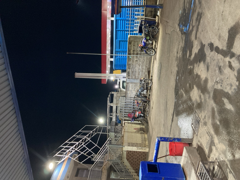 At night, a street view shows a row of parked motorcycles along a concrete surface. Above them, red and blue structures extend vertically, possibly part of a building or advertising installation. A white truck is parked behind the motorcycles. A metal structure resembling scaffolding and stairs is visible on the left, with a blue trash can and a red bucket nearby. The dark sky contrasts with the bright streetlights illuminating the scene.