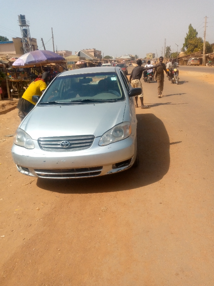 This image depicts an outdoor scene in Ube, Nigeria, on a clear, sunny day. A silver Toyota Corolla sedan is parked or stationary on a reddish-brown dirt shoulder in the foreground, angled slightly left. The vehicle's front bumper exhibits scuff marks and paint damage. To the immediate left of the car, a person dressed in a bright yellow long-sleeved shirt and dark lower garment is leaning into the driver's side or interacting with a nearby roadside stall. Directly to the right of the car, a male figure wearing a dark short-sleeved shirt and light-colored shorts stands by the driver's side mirror, facing towards the main road and extending his right arm in a gestural manner. A wide, multi-lane paved road extends into the distance on the right. On this road, another male figure in a light brown shirt is walking away from the viewer, further down the street. At least two individuals on motorcycles are also visible on the paved road, traveling in the same direction. In the background on the left, a series of market stalls with wooden frames are present, one of which is shaded by a prominent purple and white striped umbrella. Beyond these stalls, a tall metallic water tower structure rises into the sky. Various low-rise buildings line both sides of the road in the mid-ground. Strong sunlight from the left casts distinct shadows across the foreground and road.