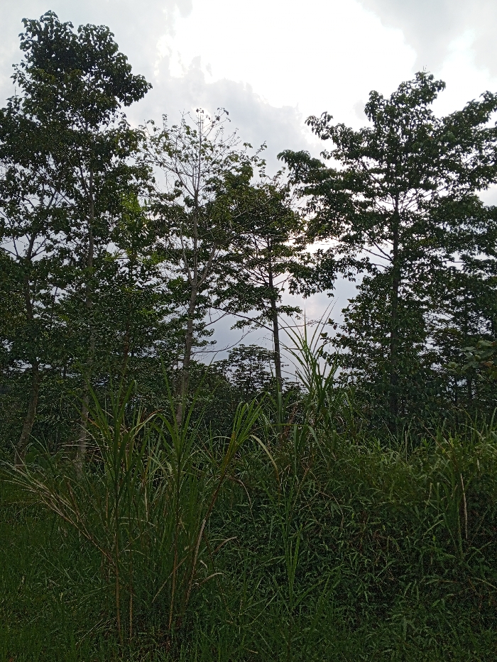 The scene depicts a dense natural landscape located in Thotagamuwa, Sri Lanka. The foreground is dominated by unmanaged green vegetation, including various tall grasses and leafy plants. Immediately behind this, a prominent line of mature trees with robust, dark green canopies extends horizontally across the frame. One tree positioned centrally exhibits a sparser foliage density compared to its neighbors. Further into the background, a continuous mass of trees forms a dense natural barrier. The sky above is heavily overcast, characterized by thick gray clouds, with a subtle light source faintly visible through the upper tree canopy on the right side. No human subjects, animals, or artificial structures are present within the image.