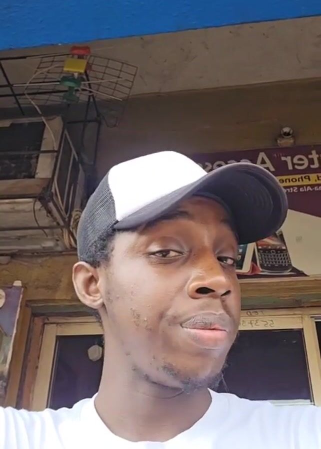 A close-up shot shows a young man with short, dark hair and brown eyes wearing a white t-shirt and a black and white baseball cap. He is looking directly at the camera, initially with a neutral expression, then briefly tilting his head and looking down slightly. The background includes a building exterior with a blue-painted top section and a sign that reads "ter Acces..." (partially obscured) and lists "Phones, Charger, High level..." along with images of electronic devices. An air conditioner unit with a metal cage is also visible on the wall.