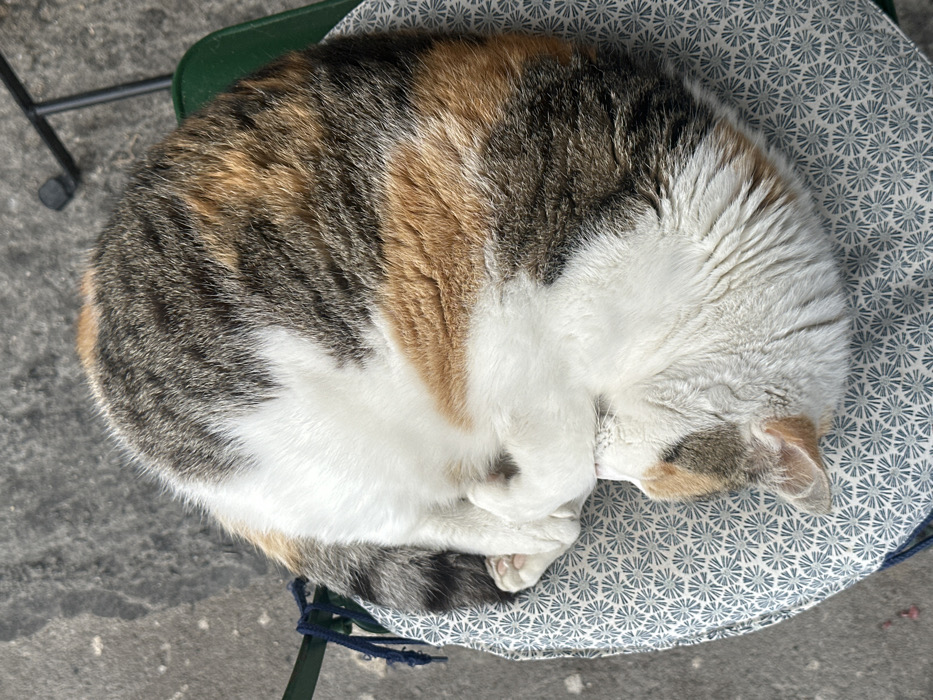 - "A domestic calico cat is depicted sleeping in a tightly curled position on a patterned chair cushion, viewed from a top-down perspective" by FM-R99HH2, licensed under CC BY 4.0