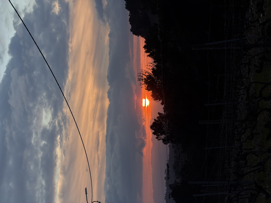 The image displays a vineyard landscape during sunset in Peso da Régua, Portugal. The sky is layered, with a band of dark grey clouds in the upper third transitioning to a horizontal expanse of orange and red-streaked clouds. The sun, appearing as a bright, horizontally elongated orange-red disc, is positioned slightly right of the frame's center, partially obscured by a dark silhouette of trees on the horizon. The midground features a dense, dark silhouette of mixed tree species. The foreground consists of a vineyard, showing numerous dormant, gnarled vine stocks and vertical support posts with horizontal wires, all rendered in deep shadow. In the upper left quadrant, a portion of a street light fixture is visible, and a prominent dark utility wire extends diagonally from the upper left across the sky. No human or animal subjects are present.