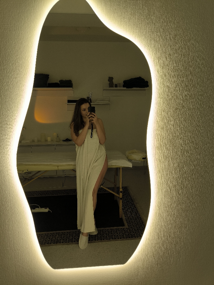 A woman in a towel takes a mirror selfie in a room with a massage table. The room is sparsely decorated with candles and shelves. She holds her phone in her right hand, her face partially obscured. The mirror is irregular in shape, illuminated by a light around its border. The image is primarily lit by the mirror's light and a lamp.