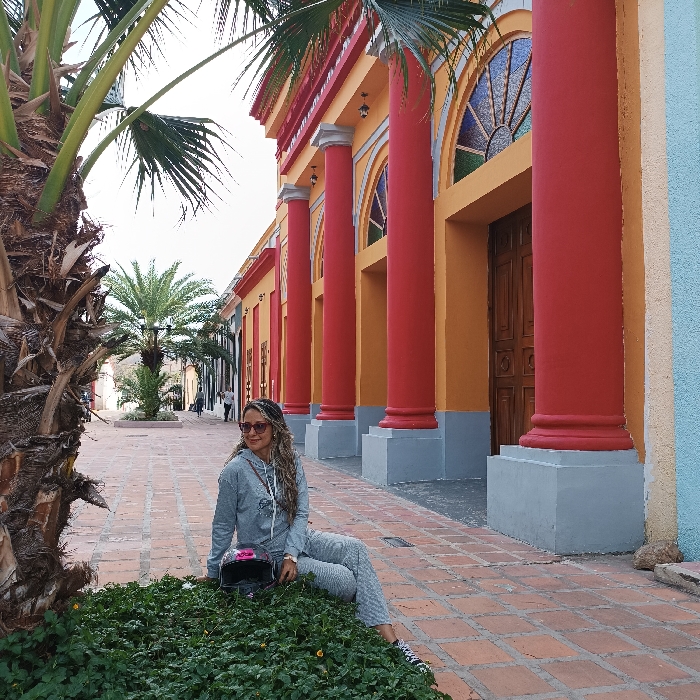 A woman in a gray sweatsuit sits on a bed of greenery next to a brick walkway. She is positioned near a palm tree, with another in the distance. Behind her, a vibrant building features red columns and arched windows with colorful panes. The structure is painted in shades of yellow, orange, and blue, contributing to the bright and cheerful atmosphere. People can be seen strolling along the walkway further down the street.