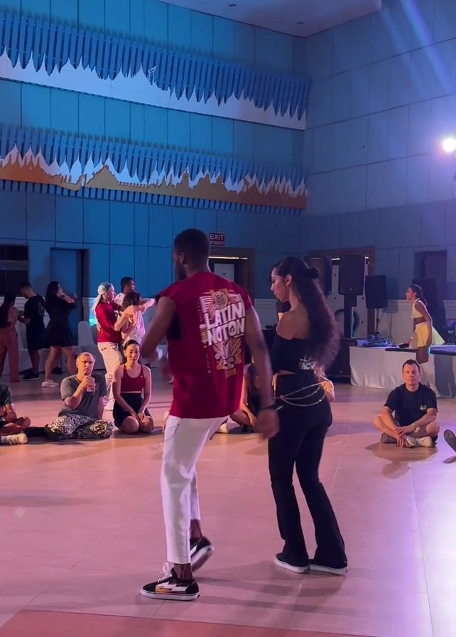 Inside a large, high-ceilinged room with pale-blue walls and a light-wood floor, a man and a woman perform a dance in front of a seated audience. The man wears a red tank top with white pants, and black-and-white sneakers. The woman wears a black, off-the-shoulder top and black pants. The audience sits cross-legged on the floor, surrounding the dancers. Additional people stand along the side walls and near a raised stage in the background. The room is lit with multiple stage lights.
