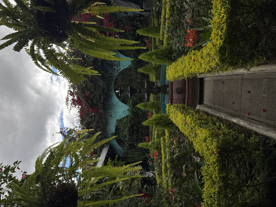 An ornamental garden features a stone pathway flanked by neatly trimmed hedges with small, vibrant flowers. A tiered fountain anchors the center, backed by an archway covered in foliage and vibrant red flowers. Ferns hang overhead, framing a view of a cloudy sky. The composition is verdant and symmetrical, suggesting a formal yet lush garden design.