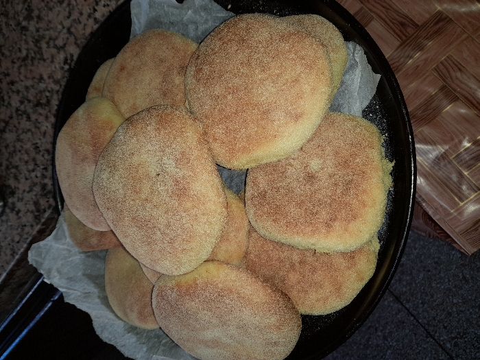 - "In the city of Unknown, Unknown, a static high-angle view captures a dark, circular metal pan containing approximately a dozen light golden-brown, flattened, round to oval bread items" by FM-VWBni2, licensed under CC BY 4.0