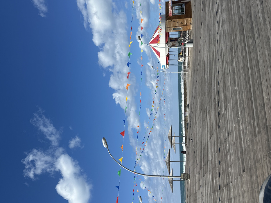 The image depicts a vibrant, sunny outdoor scene at the Tel-Aviv Port (Namal Tel Aviv) in Tel-Aviv, Israel, specifically on a wide wooden pier. The sky is bright blue with scattered white cumulus clouds. Numerous strings of colorful triangular pennant flags (bunting) are strung horizontally across the scene, creating a festive atmosphere. In the mid-ground, three mushroom-shaped shade structures with light-colored canopies are positioned along the left side of the pier, overlooking the Mediterranean Sea. Below the central shade structure, a single individual is seated, facing the water. The sea exhibits moderate waves breaking against a low, light-colored concrete barrier. A dark-feathered bird stands on the wooden pier in front of these structures. A curved streetlamp with an oval fixture stands prominently near the leftmost shade structure. On the right side of the mid-ground, a classic-style carousel featuring a red and white striped conical roof is operational, with multiple individuals, including adults and children, visible inside. Adjacent to the carousel is a small, light-colored wooden kiosk structure, possibly a concession stand or ticket booth. Another identical streetlamp is situated to the left of the carousel. A bicycle is parked upright near the carousel. The foreground consists of the weathered wooden plank pier, extending towards the viewer, with faint, repetitive dark oval markings resembling footprints on its surface. The overall scene suggests a leisurely daytime environment.