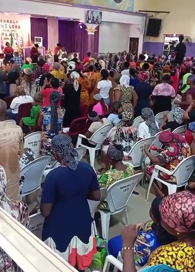 large room filled with people, mostly women, seated in rows of white plastic chairs. Many of the women are wearing colorful clothing and head coverings. Some people are standing and dancing. In the background, there's a stage with a raised platform and people on it. There are flags and decorations visible on the stage. A sign reads "SURELY THE LORD IS IN THIS PLACE GEN." The room appears to be a large hall or auditorium, with the event seemingly a church service or religious gathering. A person films from a slightly elevated position, overlooking the crowd.