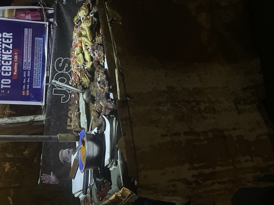 A roadside food stall is pictured at night. A sign advertises a church event called "To Ebenezer" on December 13th and 14th, 2025, featuring testimonies, praises, a thanksgiving, and a love feast. The event is hosted by the Mountain of Word and Grace Liberation Ministry. The table is piled high with food, including meat and vegetables, served with a ladle. A pot and a stack of papers are nearby. Another poster displaying a man with his hand raised is partially visible.