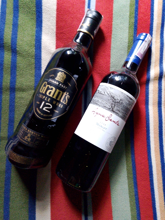 - "Two bottles, one of Grant's Triple Wood 12 blended scotch whisky, and the other of Signa Santa Merlot 2022, lie on a multicolored striped fabric" by FM-eqdM53, licensed under CC BY 4.0