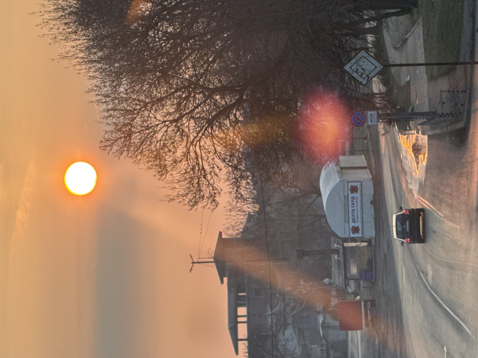 - "The image displays an urban street scene in Kazichene, Bulgaria, under a low, bright sun, indicative of either sunrise or sunset, casting a warm orange hue across the sky and environment" by FM-5BLXP2, licensed under CC BY 4.0