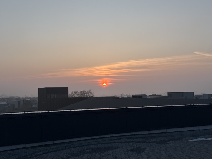 The scene depicts an outdoor panorama in Maasdijk, Netherlands, observed from an elevated position. The sky presents a gradient from light blue overhead to warm orange and pink hues near the horizon, consistent with sunrise or sunset. A prominent, circular, orange-red sun is positioned low on the horizon, slightly left of the image center. Wispy, horizontally elongated clouds are illuminated by the sun's light. The midground shows a hazy urban or industrial landscape, featuring a dark, angular, multi-story building with a flat roof located to the sun's left. Bare trees are partially visible behind this structure. Additional distant, low-rise industrial buildings or structures are discernible across the horizon. The immediate foreground consists of a dark, solid barrier or parapet. Below this barrier, a paved surface, possibly a rooftop or parking area, shows subtle patterns or marks. No individuals, specific actions, or interactions are present within the frame.