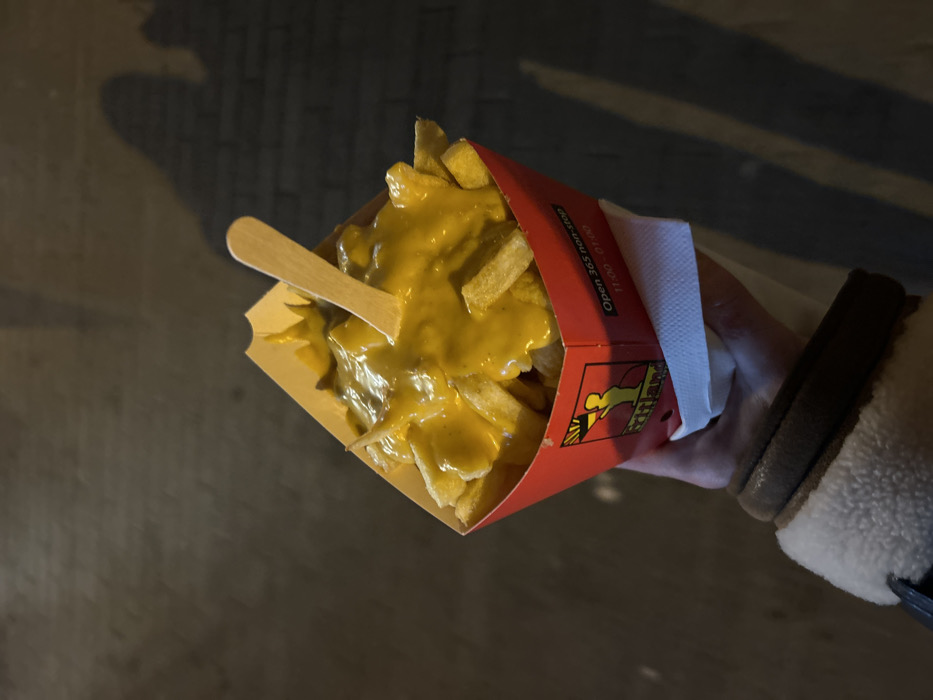 A human hand, clad in a jacket with a light-colored fleece lining and brown trim, holds a red, conical paper container. The container holds french fries thoroughly coated in a thick, uniform yellow-orange sauce, with a small wooden fork inserted into the fries. The container's visible side features a "Fritland" logo depicting a stylized figure and text "Open 365 non-stop 11:00 - 01:00". A white paper napkin is wrapped around the container's lower section. The background is a dark, indistinct paved surface, indicating an outdoor, nocturnal setting. Long, blurred shadows, consistent with human figures, are cast onto the pavement from an off-camera light source to the right. This scene takes place in Brussels, Belgium, featuring a product from the friterie Fritland, commonly located near the Bourse or Grand-Place.