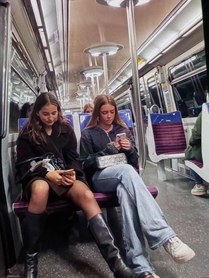 The image depicts the interior of a metro train car, a transportation system not present in Stopiņu pagasts, Latvia. Therefore, the specific location as Stopiņu pagasts, Latvia, cannot be confirmed from the image and is highly improbable. The scene shows two young females seated in the foreground, facing the camera, both looking down at their individual smartphones. The female on the left has long, dark brown, wavy hair and is wearing a dark brown or black long-sleeved coat or dress. She is wearing opaque dark tights or pantyhose and knee-high black leather boots. A black and white patterned bag with a bow-like accent rests on her lap. The female on the right has long, light brown or blonde, straight hair and is wearing a dark blue or gray hooded sweatshirt over light blue denim jeans with a wide-legged or bootcut style. She is wearing light-colored athletic shoes. A silver-toned, textured purse or bag with a chain strap is positioned on her lap. Her fingernails are painted red. In the background, a third person with blonde hair is partially visible between the two main subjects, also appearing to look at a phone. The lower legs and feet of a fourth person, wearing light-colored pants and shoes, are visible on the far right, indicating another seated passenger. The train interior features overhead fluorescent strip lighting, complemented by circular, saucer-shaped light fixtures suspended from vertical metal poles. Metal poles for standing passengers are also visible. The seats are upholstered in a striped pattern of purple and blue. Windows are present along the right side of the train car, offering a view of the exterior. The floor is dark gray or black. No direct interactions between individuals are discernible.