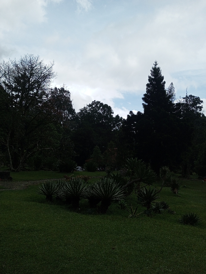 The image depicts an outdoor park or garden scene in Pachmarhi, India, under an overcast sky with patches of light blue visible. The foreground features a expanse of manicured green grass. Several agave-like plants with radiating, spiky leaves are scattered across the mid-ground and lower-right, arranged in small clusters. A dirt or gravel path is partially visible on the left, curving slightly into the background. The mid-ground and background are dominated by a dense arrangement of various trees and bushes, appearing dark and largely silhouetted against the brighter sky. On the far left, a tall deciduous tree with numerous bare branches is prominent. A distinct tall, conical evergreen tree stands on the right side of the frame. Through a gap in the foliage, a white vehicle, possibly a car or SUV, is partially visible in the distant mid-ground, slightly left of center. A muted reddish-brown structure, likely a roof, is faintly discernible behind the trees near the vehicle. No individuals or specific actions are identifiable within the scene.