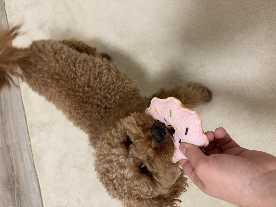 A brown poodle lies on a light beige rug. A hand holds a pink donut-shaped toy with colorful sprinkles towards the dog. The poodle has its mouth open and appears to be playfully biting the toy. The dog's tail is visible on the left, and a wooden floor is partially visible in the lower-left corner. The rug occupies most of the background.