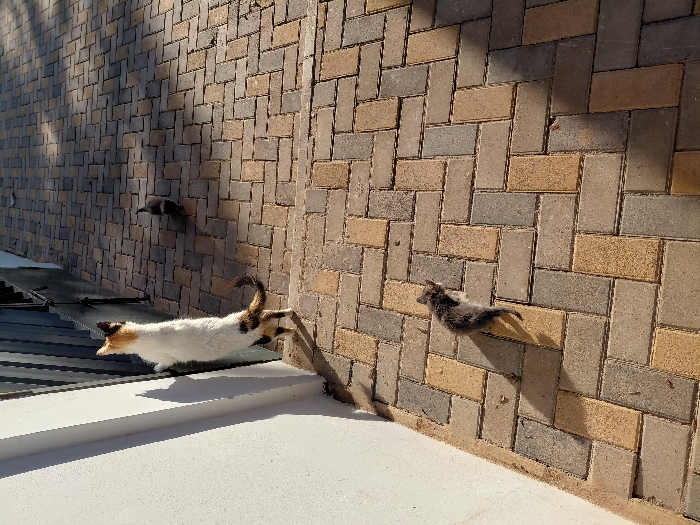 The image displays an outdoor paved area in Mohammedia, Morocco, under direct sunlight, featuring three felines. A calico cat, predominantly white with distinct black and tan markings, stands on its hind legs on a slightly raised step, its front paws pressed against a dark vertical surface, likely a gate or door. Its head is oriented upwards. Two small, dark-furred kittens are present on the multi-toned, herringbone-patterned paver surface. One kitten is positioned in the mid-ground, walking away from the calico cat. The second kitten is in the foreground, walking towards the left edge of the frame. A white wall is visible on the left, casting a sharp shadow. Shadows from the cats are also projected onto the pavers. No human subjects are depicted.