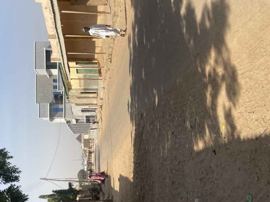 An outdoor scene depicts a street in the city of Unknown, Unknown, under a clear, bright sky. The road surface transitions from dirt on the left shoulder to a partially paved, dusty asphalt in the center, and back to dirt on the right shoulder. Prominent shadows from an unseen overhead canopy of leaves are cast across the foreground and midground of the road, suggesting a sunny day. Two individuals are visible in the midground. On the left dirt shoulder, a person in a long, flowing, dark pink or maroon garment, possibly a full-body covering, walks away from the camera. On the right side of the paved road, a male subject wearing a white long-sleeved traditional robe (thobe/kaftan) and a white cap walks towards the camera, his gaze directed slightly to his left. The environment features a mix of architectural styles. On the immediate right, a faded yellow single-story building with a covered porch supported by thin wooden posts and a green door is present. Further down the street, a multi-story building with a modern, light grey textured facade, blue-tinted windows, and a black water tank on its roof stands out. Adjacent to this, a row of identical grey structures, possibly under construction or newly built, extends into the background. On the left side of the street, utility poles with wires are visible, alongside scattered low-rise structures and sparse vegetation. In the far background, under a hazy sky, indistinct buildings and a single structure with a conical roof are discernable. No direct interactions between the visible individuals are apparent.