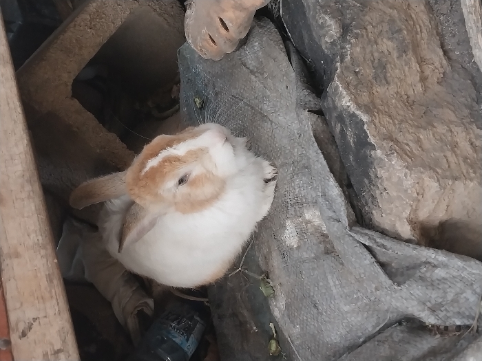 A white rabbit with tan markings on its head and ears sits on a grey, textured surface that appears to be a tarp or bag. The rabbit is positioned slightly to the left of the frame, and the scene is illuminated with a natural light source. The background is cluttered with various materials, including pieces of wood and other objects that are partially obscured.