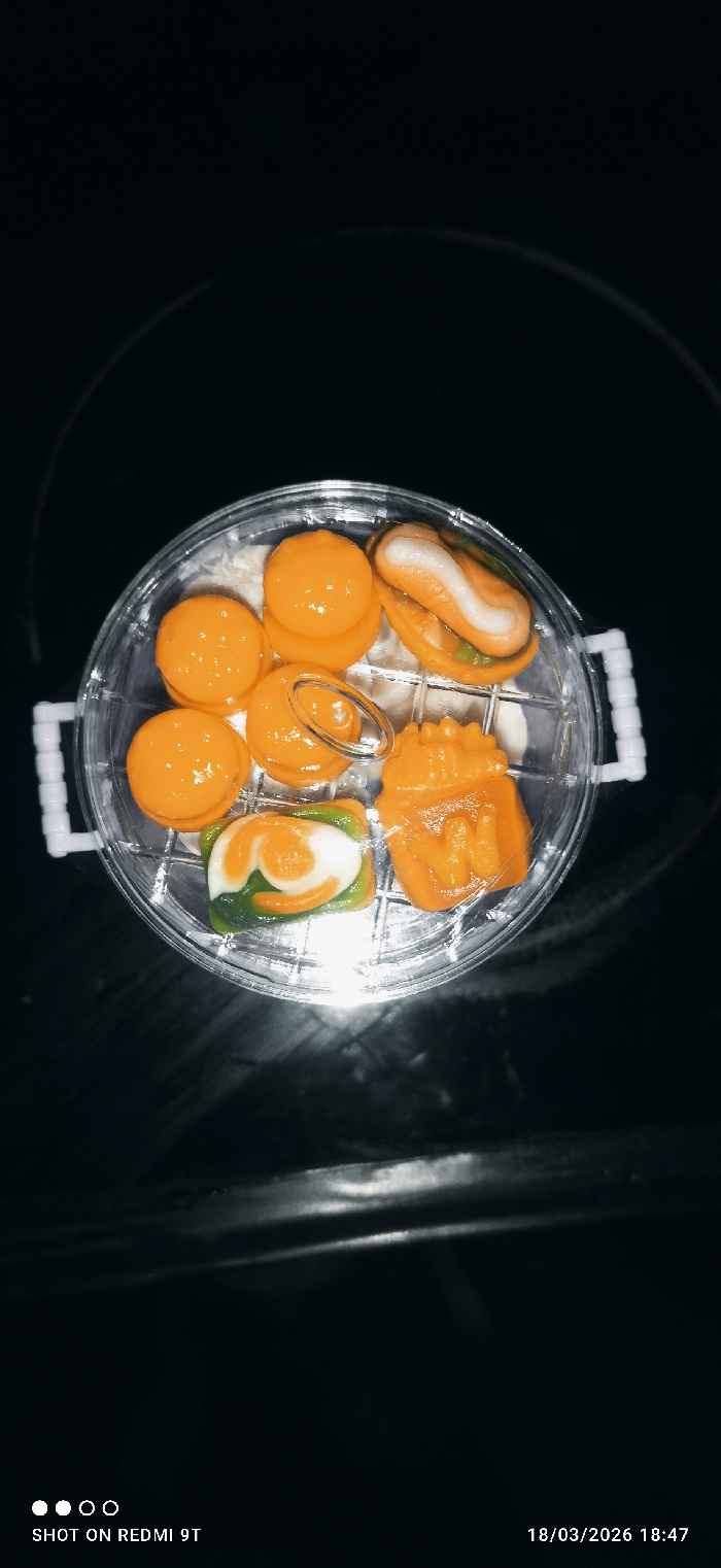 An overhead, low-light photograph depicts a transparent, circular container, resembling a miniature grill with a grid pattern, holding various small, brightly colored items. The container, approximately 10-12 cm in diameter, features two small, white, rectangular handles. Inside, resting on a white granular base, are four glossy orange, rounded objects resembling macarons or small burgers; one orange, white, and green object shaped like a mussel; one rectangular item with swirled white and green patterns; and one orange object resembling a serving of french fries or a stylized "W." A transparent plastic ring is also visible among the orange items. The container is situated on a dark, reflective surface, possibly a kitchen countertop or stovetop, which displays faint circular patterns and ambient light reflections. No individuals are present. The scene is located in the city of Unknown, Unknown. The image includes a watermark stating "SHOT ON REDMI 9T" at the bottom left and a timestamp "18/03/2026 18:47" at the bottom right.