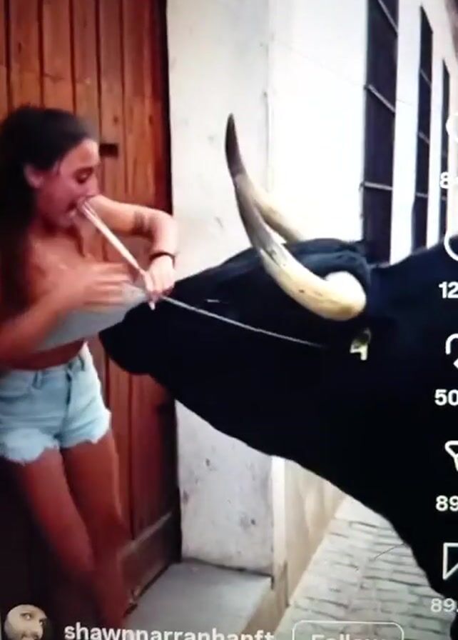 A woman in a gray tube top and denim shorts is struggling with a black bull. She's holding onto what appears to be a white rope or strap attached to the bull's head. The bull has large, curved horns. A man is standing behind the bull. The scene is set outdoors, near a building with a wooden door and barred windows. The video is a screen recording of a social media app, with icons for likes, comments, and shares visible. The username "shawnnarranhaft" is displayed along with the caption "The Bull Who Caught a Thief?!"