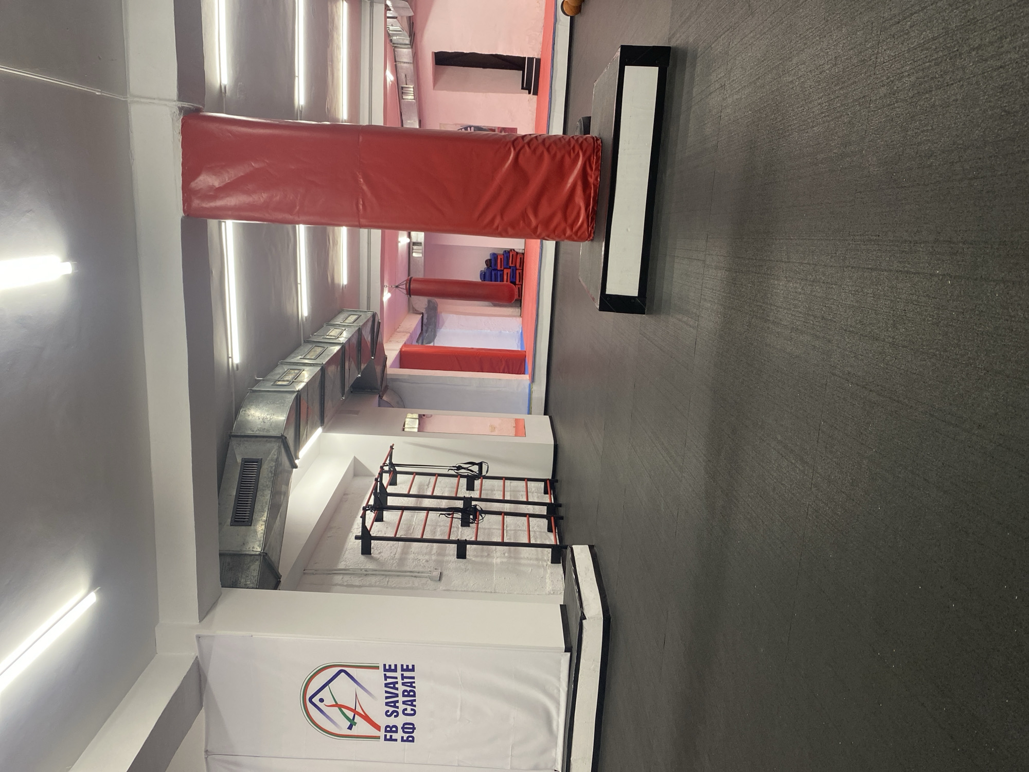 The image displays the interior of an unoccupied martial arts training facility, located in Asenovgrad, Bulgaria