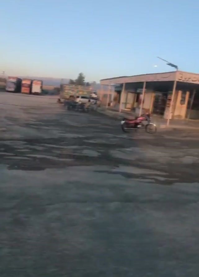shot of a landscape, moving from left to right. Initially, a building is visible, followed by a person walking along a wall with writing. The camera continues to move past a pole and then focuses on the terrain itself, which appears dry and sparsely populated with rocks. In the distance, there's a view of a mountain range. The sky is clear and blue.