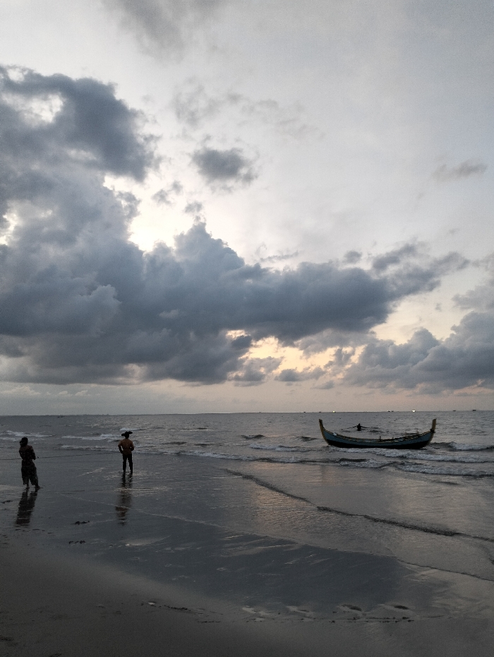 The image captures a coastal scene in Curehtunong, Indonesia, under an overcast sky. The upper two-thirds of the frame are filled with dense, dark grey clouds, with a lighter patch of sky visible towards the horizon, suggesting low light conditions such as dusk or dawn. The lower portion of the image shows a calm body of water with gentle waves breaking on a wet, reflective sandy beach. Two human figures are visible in the foreground. On the left, a silhouetted individual stands on the wet sand near the water's edge, facing towards the right. A second silhouetted individual stands further into the shallow water, slightly right of center, facing towards the left and wearing what appears to be a hat or head covering. Both figures cast visible reflections on the wet surface. To the right, a traditional-style wooden boat, dark in color with distinctive high bow and stern, is positioned in the shallow water, oriented parallel to the shore. The boat appears unoccupied. Faint silhouettes of other vessels are discernible on the distant horizon line.