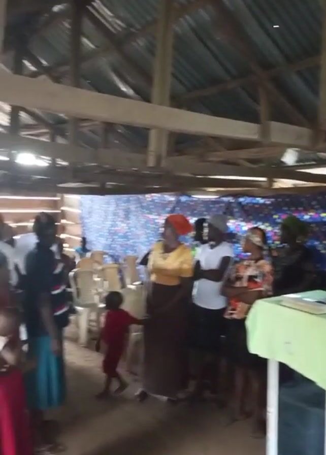 gathering of people in a simple, open-walled structure with a corrugated metal roof supported by wooden beams. The structure appears to be a community hall or informal meeting space. About a dozen individuals are visible, a mix of adults and children. Some are standing, while others are seated on plastic chairs. One woman is holding a baby. The people seem to be engaged in a meeting or discussion, based on the reaction to the speaker. A small podium with a green cloth is visible on the right side of the frame. The overall impression is of a community gathering in a simple, functional setting.
